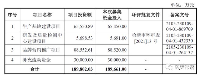 据招股书显示,本次募集资金合计18.98亿元,敷尔佳计划用于生产基地建设项目、研发及质量监测中心建设项目、品牌营销推广项目、补充流动资金,计划募集资金投入分别为6.55亿元、5691万元、8.85亿元、3亿元。可以看到,其中将用于品牌营销推广的资金占比达到46.65%。