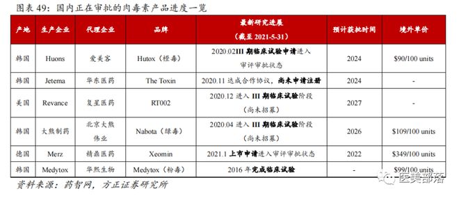 在国内非手术类医美项目中,肉毒素的排名仅次于玻尿酸,截至目前,国内已经批准上市了四个品牌的肉毒素,分别是美国艾尔建的保妥适Botox、兰州生物的衡力、法国Ipsen的吉适Dysport和韩国Hugel的乐提葆Letybo。爱美客合作的韩国HuonsBP的注射用A型肉毒毒素处于临床阶段,其适用于中度至重度皱眉纹的产品目前已完成III期临床入组,预计2024年左右上市。