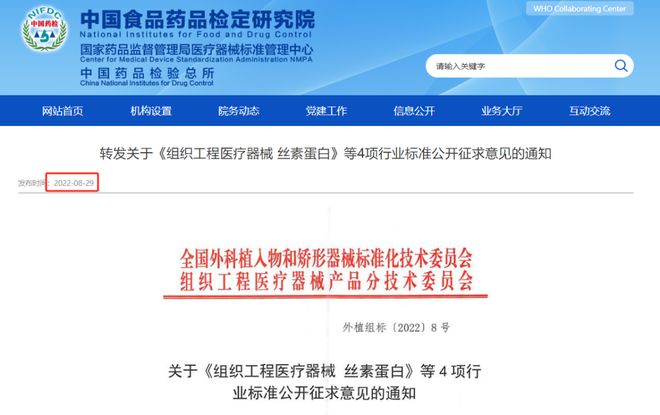 2022年8月29日,中检院转发由全国外科植入物和矫形器械标准化技术委员会组织工程医疗器械产品分技术委员会归口的《组织工程医疗器械 丝素蛋白》行业标准公开征求意见的通知。