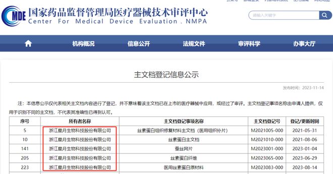 2023年6月29日,星月生物递交的“丝素蛋白纤维”主文档成功获得获得国家药监局备案登记,至此星月生物先后完成“丝素蛋白组织修复材料主文档(医用组织补片)”、“丝素蛋白主文档”、“丝素蛋白纤维”、“蚕丝网片”、“医用丝素蛋白原材料””等五项主文档登记。